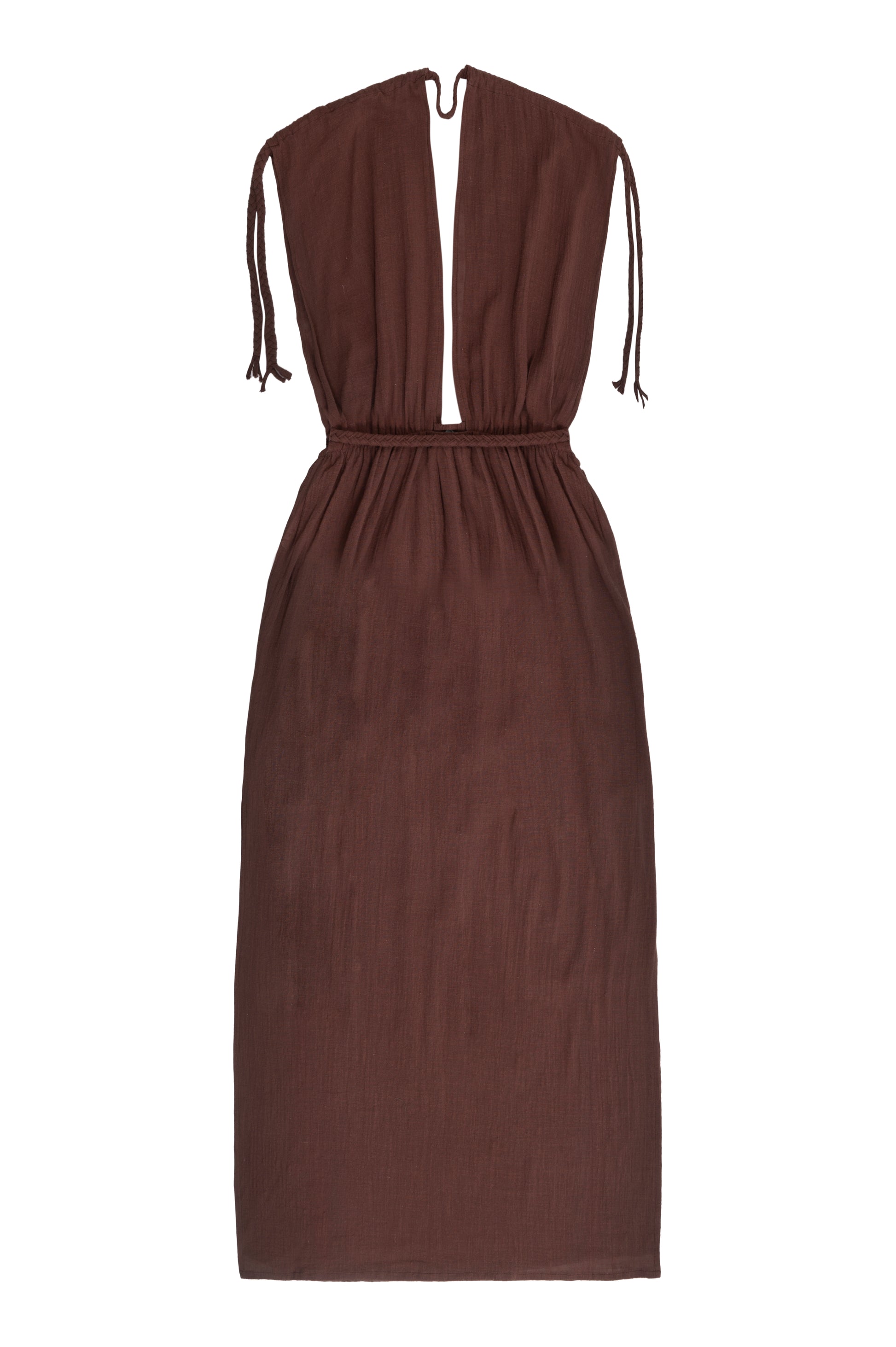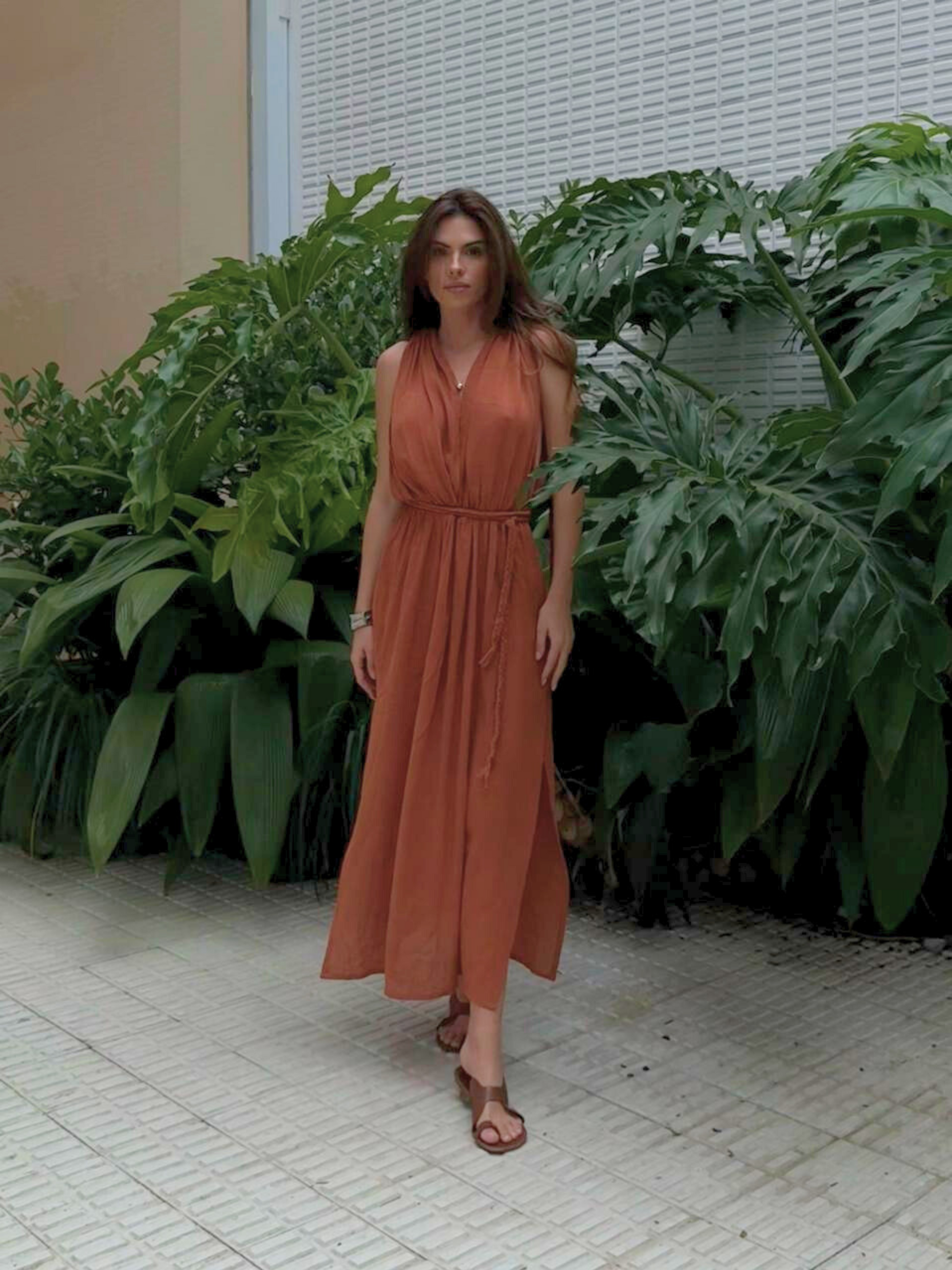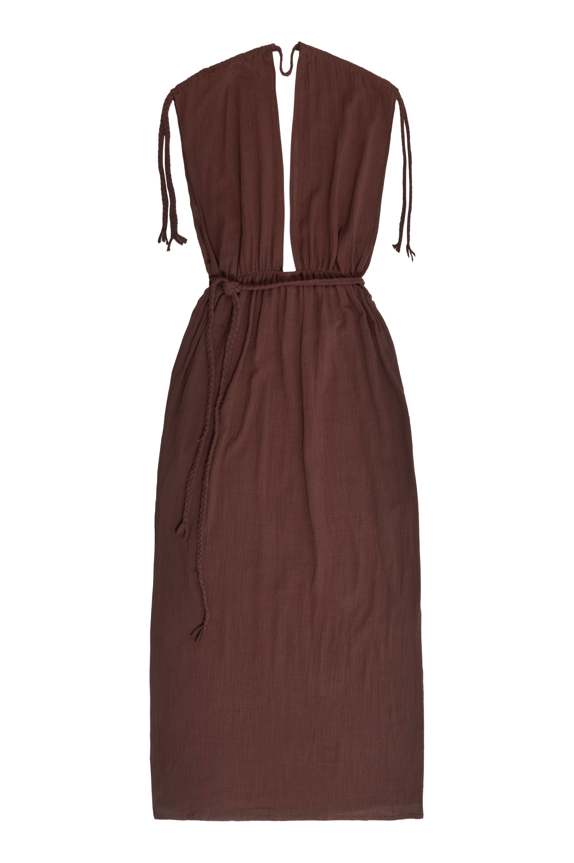 Une robe polyvalente à nouer, aux multiples usages. Confectionnée en gaze de coton, elle est confortable et légère. Elle peut être portée avec un décolleté plongeant.